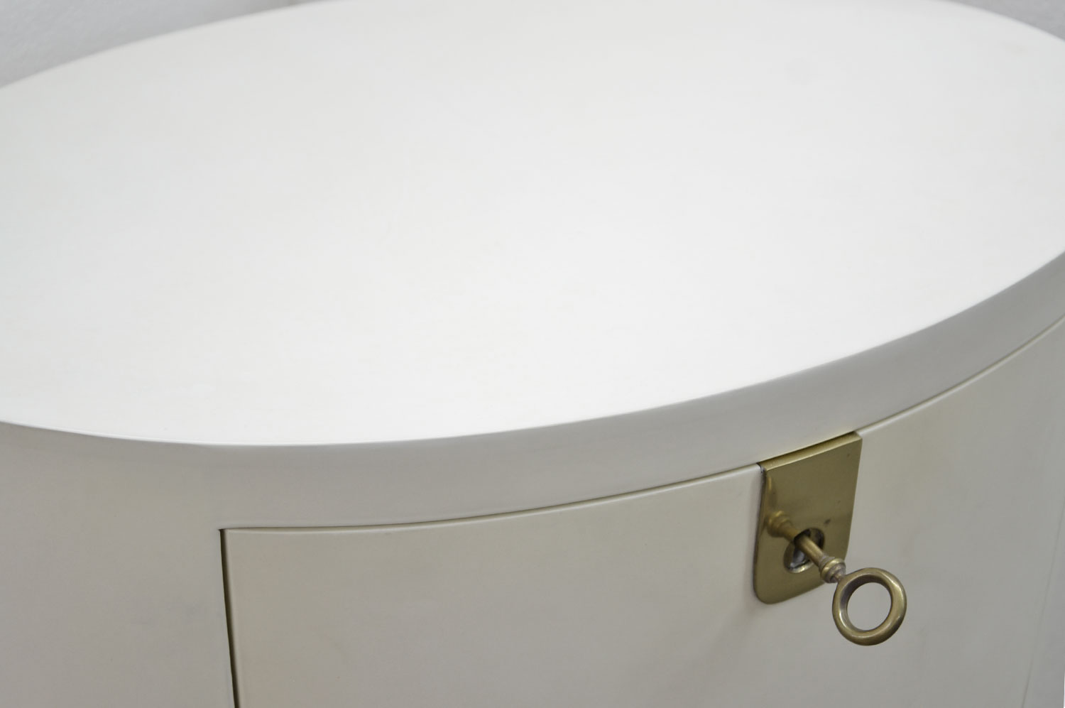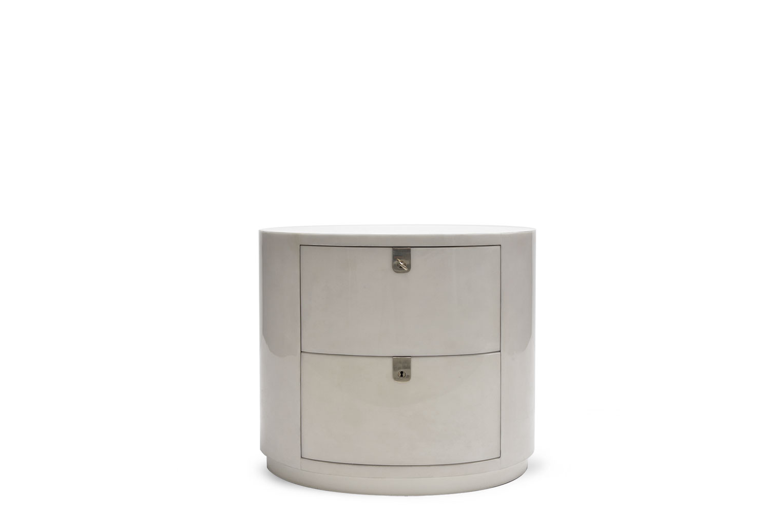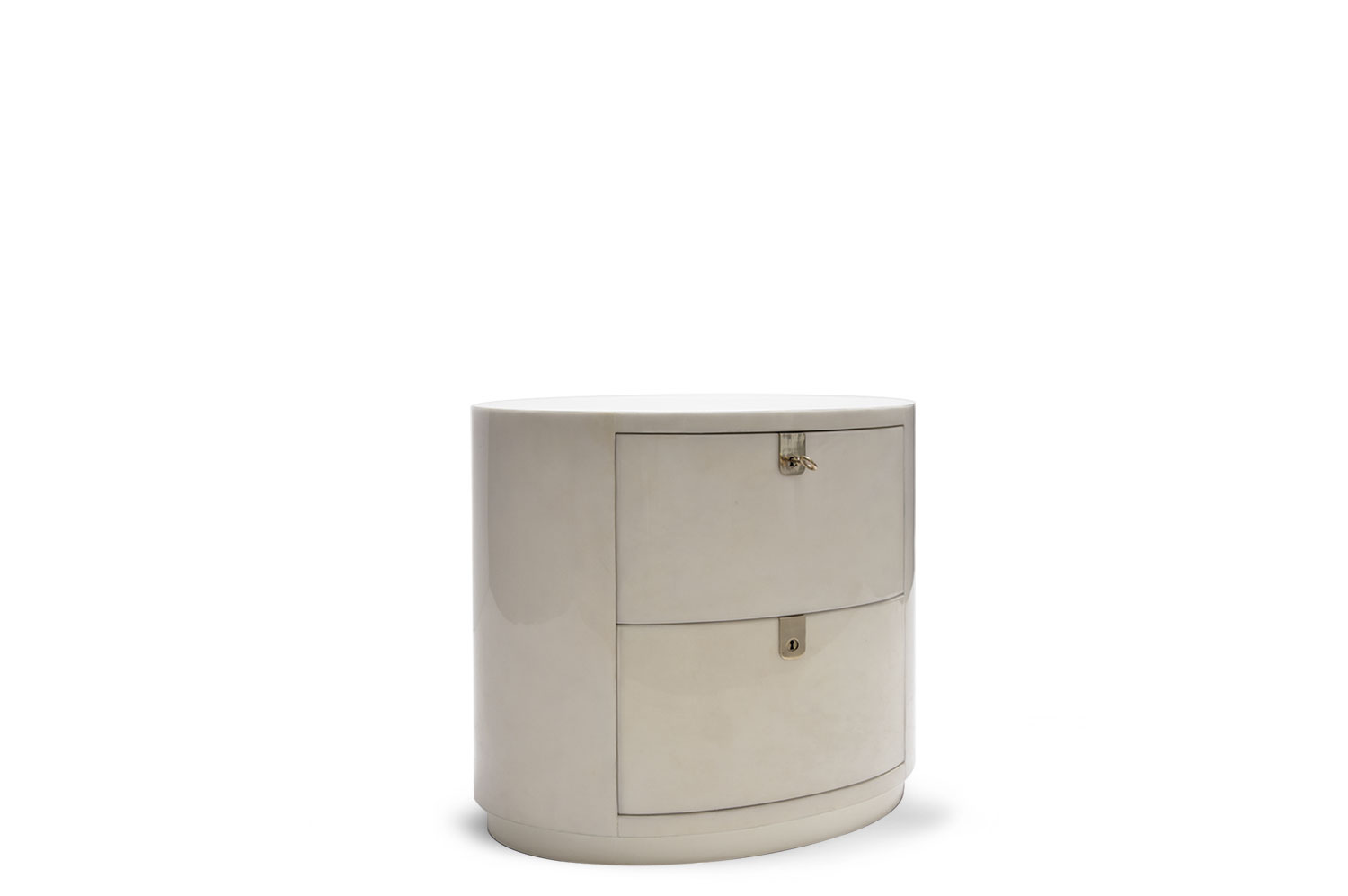 This oval parchment nightstand features 2 solid mahogany drawers and brass escutcheons. The encasement of the table is mantled with parchment, adding a touch of elegance and sophistication. Inside the solid mahogany drawers you will find a natural soft-gloss lacquer coating adding a warm appearance to the interior. To secure your personal belongings, a solid brass lock with a key is incorporated adding a decorative element while providing functionality.